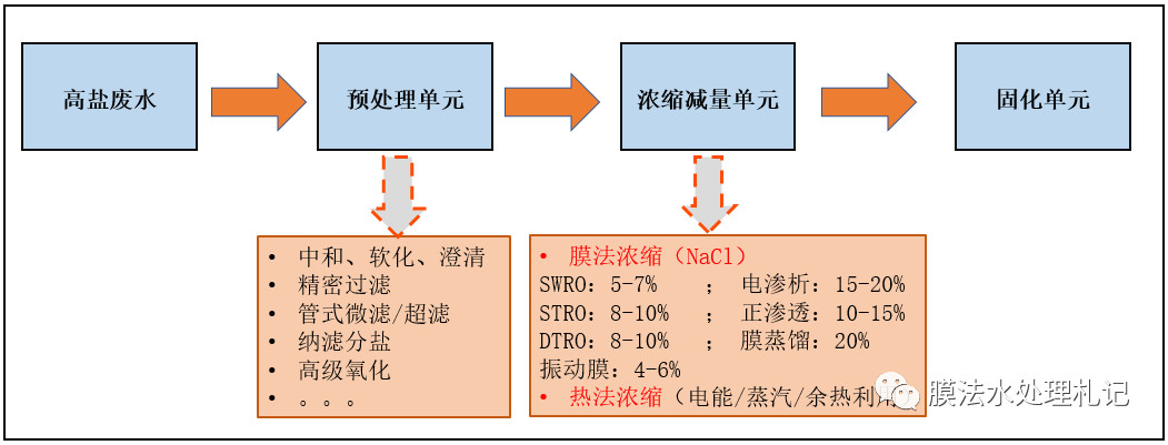 這些年零排放組合工藝越來越成熟,盡管可選的配套工藝繁多,但是總結(jié)歸納下來,末端高鹽廢水處理系統(tǒng)主要含以下幾個單元: