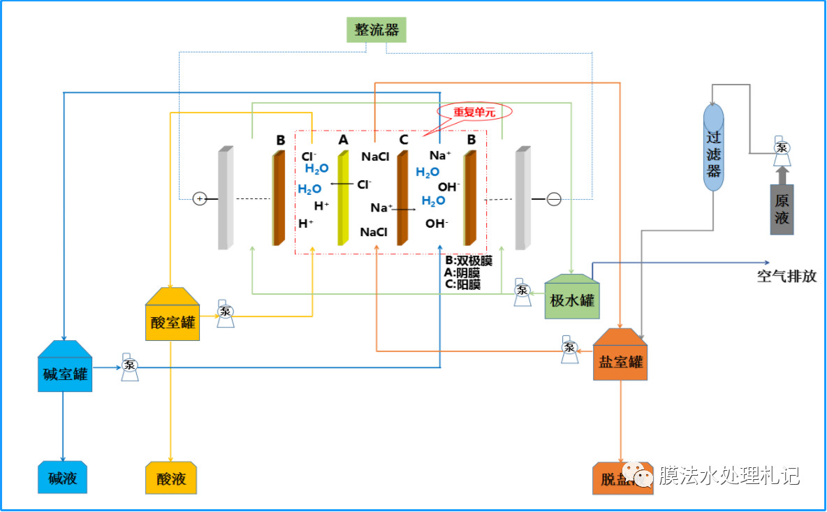 雙極膜電滲析的系統(tǒng)相對簡單,系統(tǒng)能耗主要由整流器、動設(shè)備組成。以下是常規(guī)雙極膜系統(tǒng)簡易流程圖。