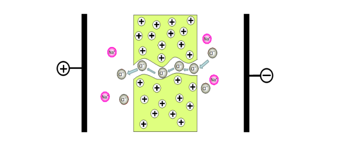 均相陰離子交換膜,屬電驅(qū)動(dòng)膜,離子電遷移膜的一種,是聚乙烯接枝聚苯乙烯季銨型強(qiáng)堿性陰離子交換膜,在外加直流電場(chǎng)力的作用下,可選擇性地讓溶液中的陰離子通過并阻擋住陽離子,如圖所示: